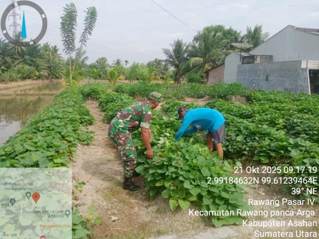 Asahan | Selain beras dan jagung, ubi rambat juga merupakan salah satu tanaman pokok bagi warga desa biaan, diharapkan dengan kegiatan seperti ini dapat memotivasi para warga, agar lebih giat lagi dalam bercocok tanam sehingga dapat memenuhi kebutuhan pangan setiap warga, dalam hal ini seperti yang dilakukan oleh Personel Bintara Pembina Desa (Babinsa) Koramil 18/Meranti jajaran Kodim 0208/Asahan Kopda Dedi Susanto turun kewilayah binaan untuk melaksanakan kegiatan Memonitor kegiatan Hanpang Ubi serta melaksanakan pendampingan Hanpangan di lahan singkong/ubi bersama-sama warga desa, kegiatan Wanwil/Hanpangan membantu petani membersihkan gulma pada tanaman singkong bersama Masyarakat melaksanakan pendampingan Ketahanan Pangan (Hanpang) jenis tanaman ubi kayu untuk membantu masyarakat yang siap panen guna tercipta kerjasama yang baik antara Babinsa dan petani sehingga terjalin hubungan yang baik dimana TNI selalu berada ditengah tengah Rakyat, pendampingan kepada petani Bapak Yusri (Petani Dusun Vll), kegiatan tersebut yang dilaksanakan bertempat di Dusun Vll Desa Rawang Pasar IV Kecamatan Rawang Panca Arga Kabupaten Asahan, Selasa (21/10/2025).