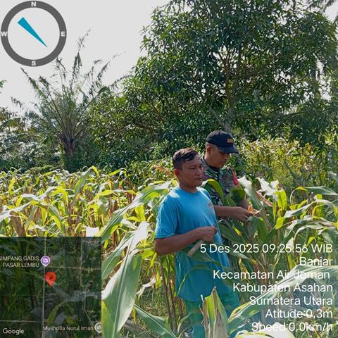 Asahan | Kegiatan membantu petani di wilayah binaan dalam hal kegiatan meningkatkan ketahanan pangan yang sedang Babinsa kerjakan merupakan wujud kemanunggalan TNI bersama rakyat, pada kesempatan tersebut seperti halnya yang dilakukan oleh Personel Bintara Pembina Desa (Babinsa) Koramil 07/Air Joman jajaran Kodim 0208/Asahan Sertu Dahrum turun kewilayah binaan untuk membantu membersihkan gulma pada tanaman jagung milik petani bersama masyarakat melaksanakan Pendampingan Hampang jenis tanaman Jagung, Wanwil yaitu membantu petani membersihkan tanaman Jagung Bapak Fadli, kegiatan pendampingan Hanpangan ikut serta dalam kegiatan merumput gulma yang mengganggu pertumbuhan tanaman jagung bersama masyarakat melaksanakan pendampingan ketahanan pangan (Hanpang) jenis tanaman jagung pioner dengan membersihkan rumput agar tanaman tetap terawat sehingga menghasilkan panenl yang lebih baik, kegiatan tersebut yang dilaksanakan bertempat di Dusun 3 Desa Banjar Kecamatan Air Joman Kabupaten Asahan, Jumat (05/12/2025).