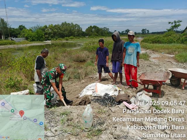 Batu Bara | Akibat Tanggul Kali Sekunder Jebol para Babinsa berjibaku bersama Masyarakat dan Pemerintah Desa memperbaiki tanggul yang jebol, dalam kesempatan ini seperti yang dilakukan oleh Personel Bintara Oembina Desa (Babinsa) Koramil 01/Medang Deras jajaran Kodim 0208/Asahan Serka Rudi turun kewilayah binaan untuk melaskanakan kegiatan Gotong Royong bersama warga dan Kepling membantu mengisi karung dengan pasir untuk membuat tanggul penahanan air dipinggir sungai bertujuan agar disaat air pasang tidak masuk kepemukiman warga, sebagai wujud bentuk kepedulian Babinsa kepada warga binaan untuk selalu berkerjasama agar tetap Selalu Kompak di wilayah Kelurahan Pangkalan Dodek, bersama dengan Bapak Julfikar, Bapak Syahroni, Bapak Budiman dan Bapak Roni, kegiatan tersebut yang dilaksanakan bertempat di Kelurahan Pangkalan Dodek Kecamatan Medang Deras Kabupaten Batu Bara, Rabu (09/07/2025).
