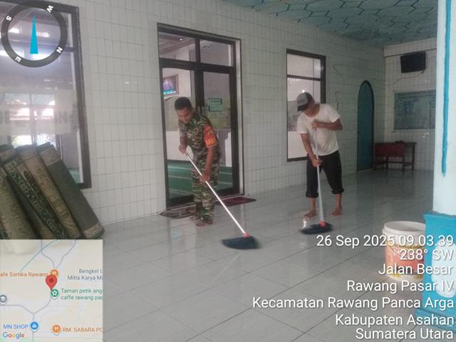 Asahan  |  Dalam rangka untuk memelihara dan menjalin hubungan baik dengan komponen masyarakat, untuk meningkatkan Sinergitas antara TNI dengan masyarakat, dengan menyiapkan tempat ibadah, para Babinsa melaksanakan karya bhakti pembersihan lingkungan Rumah Ibadah Gereja atau Mesjid yang ada diwilayah binaan, dalam kesempatan ini seperti yang dilakukan oleh Personel Bintara Pembina Desa (Babinsa) Koramil 18/Meranti jajaran Kodim 0208/Asahan Kopda Dedi Susanto turun kewilayah binaan untuk melaksanakan kegiatan Gotong royong ditempat ibadah, dengan melaksanakan membantu pembersihan sekitaran rumah ibadah Mesjid, dengan melaksanakan Bahkti TNI dengan giat Jumat bersih membantu Najir membersihkan Mesjid, agar warga masyarakat dapat beribadah dengan nyaman serta menjalin hubungan  silaturahmi yang baik antara Babinsa dengan warga binaan, bersama dengan Bapak Ishak Nasution (warga Dusun VIII), kegiatan tersebut yang dilaksanakan bertempat di Dusun VIII Desa Rawang Pasar IV Kecamatan Rawang Panca Arga Kabupaten Asahan, Jumat (26/09/2025).