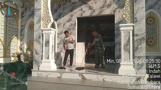 Batu Bara | Dalam rangka untuk memelihara dan menjalin hubungan baik Antara Babinsa dan masyarakat, meningkatkan rasa kepedulian terhadap masyarakat pada umumnya, untuk memelihara, menjalin hubungan baik Antara Babinsa dengan masyarakat dan untuk meningkatkan rasa kepedulian terhadap masyarakat pada umumnya, dalam kesempatan ini seperti yang dilakukan oleh Personel Bintara Pembina Desa (Babinsa) Koramil 04/Talawi jajaran Kodim 0208/Asahan Koptu SG Tampubolon turun kewilayah binaan untuk melaksanakan kegiatan Bakti TNI yakni gotong royong bersama warga dalam rangka untuk membantu pembersihan rumah Ibadah, dengan melaksanakan kegiatan membantu pembersihan rumah Ibadah Mesjid Al-Rahman guna memberikan suasana yang bersih dan rapi sehingga tercipta kenyamanan bagi warga yang ingin beribadah, bersama dengan Bapak Faisal Eka (Petugas Mesjid), kegiatan tersebut yang dilaksanakan bertempat di Dusun 2 Desa Dahari Indah Kecamatan Talawi Kabupaten Batu Bara, Minggu (08/02/2026).