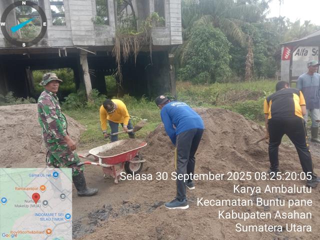 Asahan  |  Dalam rangka pelaksanaan kegiatan Marharoan Bolon bersama perangkat desa dan masyarakat, hal ini menyebabkan masyarakat sangat antusias dalam setiap suatu kegiatan karena Babinsa selalu ada ditengah-tengah mereka sehingga diharapkan jalinan kerjasama tersebut putus dan terus menerus dapat terjalin dengan baik, dalam kesempatan ini seperti yang dilakukan oleh Personel Bintara Pembina Desa (Babinsa) Koramil 13/Buntu Pane jajaran Kodim 0208/Asahan Serda Hery Siregar turut serta melaksanakan kegiatan Gotong royong bersama masyarakat membantu memperbaiki dan menimbun jalan yang berlobang dalam kegiatan tersebut diharapkan dapat mempererat hubungan kekompakan dan kemanunggalan TNI  dengan rakyat sekaligus untuk menumbuhkan rasa saling tolong menolong, kegiatan Gotong Royong bersama warga desa binaan, gotong royong bersama masyarakat memperbaiki jalan di dusun Vl Desa Karya Ambalutu, agar akses warga menjadi lancar dan mudah dilalui, bersama dengan Bapak Suryanto Sinaga (Kades Karya Ambalutu), Kadus Vl Robet Sipahutar (Kadus), Bapak Warman (Kadus) dan Warga Desa Karya Ambalutu, kegiatan tersebut yang dilaksanakan bertempat di Dusun Vl Desa Karya Ambalutu Kecamatan Buntu Pane Kabupaten Asahan, Slasa (30/09/2025).