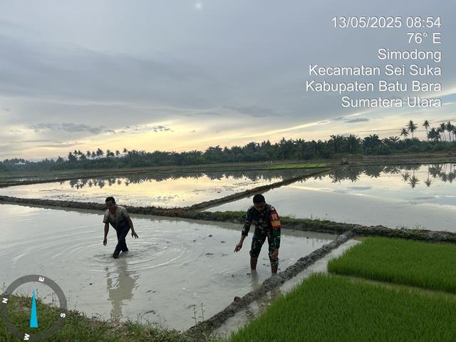 Batu Bara | Tujuan dari pendampingan ini yaitu merupakan upaya untuk mempercepat masa tanam dan bentuk kepedulian TNI, hal ini dilakukan guna membantu Pemerintah Daerah sebagai salah satu wujud nyata di lapangan dalam menyukseskan ketahanan pangan, dalam kesempatan ini seperti yang dilakukan oleh Personel Bintara Pembina Desa (Babinsa) Koramil 02/Air Putih jajaran Kodim 0208/Asahan Sertu Mhd Firanda turun kewilayah binaan untuk melaksanakan kegiatan Hanpangan membantu Petani membersihkan Rumput dan Perbaikan bedeng pada persemaian bibit Padi agar bibit padi tumbuh dengan bagus, bersama dengan Bapak Ucok (Pemilik lahan), kegiatan tersebut yang dilaksanakan bertempat di Desa Simodong Kecamatan Sei Suka Kabupaten Batu Bara, Rabu (14/05/2025).