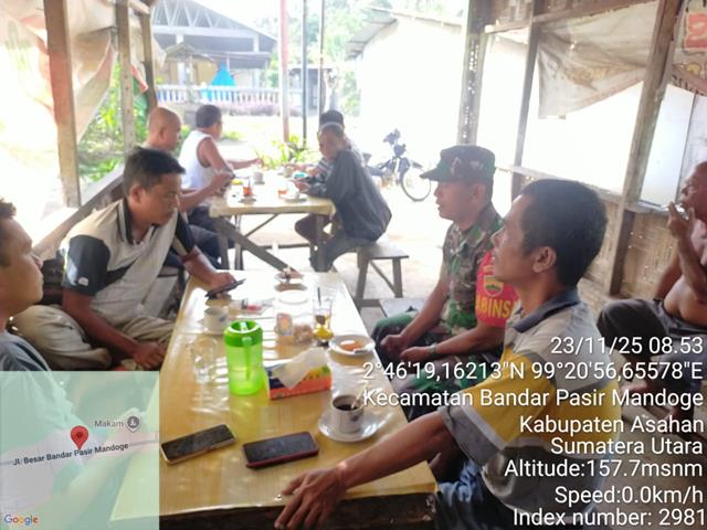Dalam rangka agar terjalin nya hubungan baik Antara Babinsa dengan Warga masyarakat untuk menunjang Tupoksi Apter, dalam kesempatan ini seperti yang dilakukan oleh Personel Bintara Pembina Desa (Babinsa) Koramil 14/Bandar Pasir Mandoge jajaran Kodim 0208/Asahan Serka L Siringo Ringo turun kewilayah binaan untuk melaksanakan Komunikasi Sosial (Komsos) bersama warga masyarakat dalam rangka membicarakan tentang Kamtibmas diwilayah desa binaan, dengan melaksanakan komsos membahas tentang Pos Kamling agar tetap diaktifkan kembali supaya terjaga keamanan dan ketertiban di Desa, kegiatan ini dilaksanakan guna membangun kebersamaan dan kekompakan dalam melaksanakan keamanan di dusun sehingga tetap kondusif, bersama dengan Bapak Marpaung, Bapak Sitompul dan Bapak Sinurat, kegiatan tersebut yang dilaksanakan bertempat di Dusun lII Desa Bandar Pasir Mandoge Kecamatan Bandar Pasir Mandoge Kabupaten Asahan, Minggu (23/11/2025).