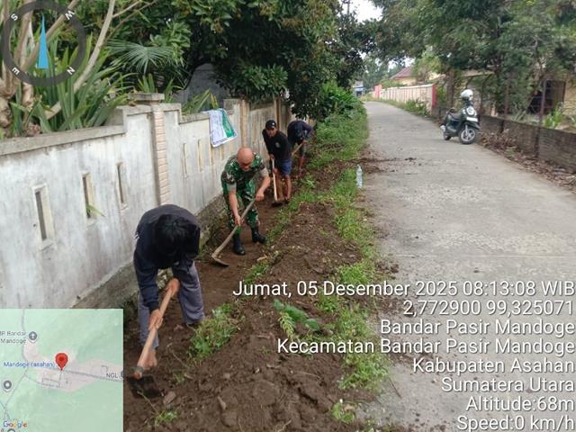 Asahan | Saat ini wilayah desa binaan sudah mulai musim penghujan khususnya diwilayah Kecamatan Dolok Batunanggar guna mengantifasi derasnya air hujan yang turun, apabila irigasi lancar selain terhindar dari bahaya banjir juga terhindar dari serangan nyamuk, dalam kesempatan ini seperti yang dilakukan oleh Personel Bintara Pembina Desa (Babinsa) Koramil 14/Bandar Pasir Mandoge jajaran Kodim 0208/Asahan Serma Roy Nababan turun kewilayah binaan untuk melaksanakan kegiatan Gotong Royong membersihkan Parit Disisi kanan kiri Jalan bersama masyarakat dengan melaksanakan gotong royong membersihkan parit dan bahu jalan. Kegiatan tersebut diharapkan dapat mempererat hubungan kekompakan dan keharmonisan dalam menunjang tugas pokok TNI agar semakin dicintai Rakyat, bersama dengan Bapak Agus, Bapak Suarno dan Bapak Rijal, dalam pelaskanaan kegiatan Gotong-royong tersebut yang dilaksanakan bertempat di Dusun IV Desa Mandoge Kecamatan Bandar Pasir Mandoge Kabupaten Asahan, Jumat (05/12/2025).