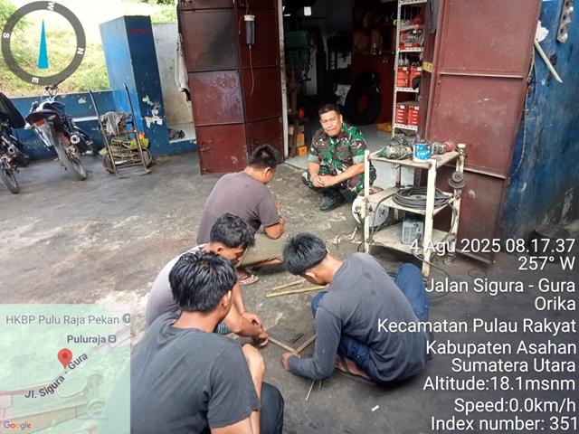 Asahan | Dalam rangka untuk menjalin silaturahmi dengan warga binaan, dalam kesempatan ini Babinsa melakukan Komunikasi Sosial dengan warga yang sedang memperbaiki mobil untuk menciptakan interaksi yang baik. Babinsa juga berperan sebagai aparat teritorial yang mendorong perekonomian warga binaan, dalam kesempatan ini seperti yang dilakukan oleh Personel Bintara Pembina Desa (Babinsa) Koramil 16/Pulau Rakyat jajaran Kodim 0208/Asahan Serka Syahrul turun kewilayah binaan untuk melaksanakan kegiatan komunikasi Sosial (Komsos) di Bengkel Mobil Abang Adek dalam rangka untuk mimbina Silaturahmi dan menambah penghasilan keluarga, bersama dengan Bapak Edi Pemilik Bengkel Mobil, Bapak Rasutono Mekanik, Bapak Hariadi Anggota Mekanik dan Bapak Syahmino, kegiatan tersebut yang dilaksanakan bertempat di Dusun 3 Desa Pulau Rakyat Pekan Kecamatan Pulau Kabupaten Asahan, Selasa (05/08/2025).