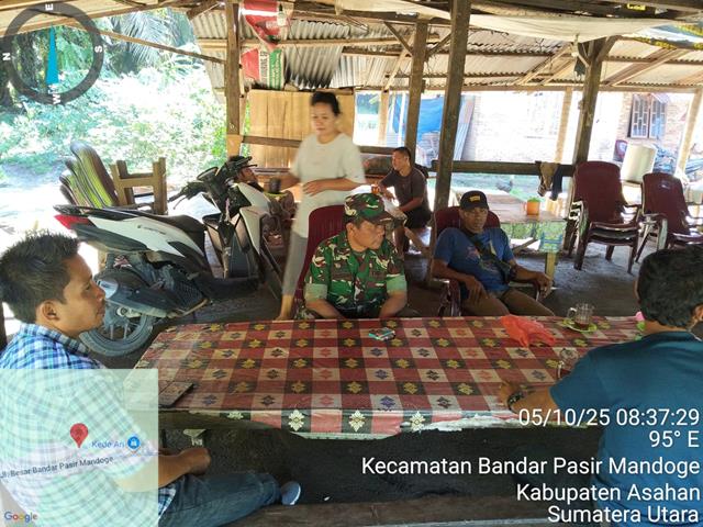 Asahan | Dalam rangka agar terjalinnya hubungan dan Komunikasi yang baik antara Babinsa dengan masyarakat Desa binaan serta agar terjalinnya hubungan yang baik antara Babinsa dan masyarakat binaan, dalam kesempatan ini seperti halnya yang dilakukan oleh Personel Bintara Pembina Desa (Babinsa) Koramil 14/Bandar Pasir Mandoge jajaran Kodim 0208/Asahan Peltu D Siburian turun kewilayah binaan untuk melaksanakan kegiatan Komunikasi Sosial (Komsos) bersama dengan warga masyarakat binaan, bersama dengan masyarakat melaksanakan Komsos guna menjalin kerjasama yang baik dan humanis dalam membahas Poskamling supaya tetap menjaga kamtibmas demi terciptanya situasi yang kondusif, Komsos bersama Masyarakat guna mempererat hubungan Silahturahmi yang baik dan Humanis serta menumbuhkan kebersamaan antara Babinsa dengan masyarakat untuk mendukung tugas pokok TNI agar semakin dicintai masyarakat, bersama dengan Bapak Sarmin, Bapak Haris dan Bapak Sagala, kegiatan tersebut yang dilaksanakan bertempat di Dusun III Desa Bandar Pasir Mandoge Kecamatan Bandar Pasir Mandoge Kabupaten Asahan, Minggu (05/102/2025).