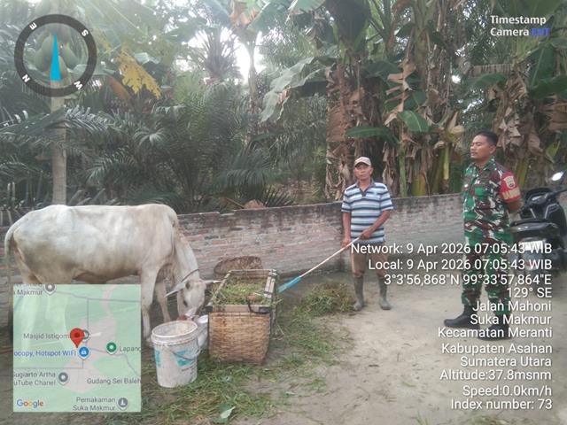 Asahan  |  Dalam rangka agar terjalinnya hubungan dan Komunikasi yang baik  antara Babinsa dengan masyarakat Desa binaan serta agar terjalinnya hubungan yang baik antara Babinsa dan masyarakat binaan, dalam kesempatan ini seperti halnya yang dilakukan oleh Personel Bintara Pembina Desa (Babinsa) Koramil 18/Meranti jajaran Kodim 0208/Asahan Serda Blego Surodiharjo turun kewilayah binaan untuk melaksanakan kegiatan Komunikasi Sosial (Komsos) bersama dengan warga masyarakat binaan, bersama dengan masyarakat melaksanakan Komsos guna menjalin kerjasama yang baik dan humanis dalam membahas Poskamling supaya tetap menjaga kamtibmas demi terciptanya situasi yang kondusif, Komsos di salah satu rumah yang berada di desa binaan, dengan mendatangi salah satu pemilik peternakan hewan lembu. babinsa memberi moti pasi semangat agar masyarakat semangkin giat untuk mengembangkan usahanya, bersama dengan Bapak Waerdi (pemilik peternakan) dan Bapak Paijan (warga Dusun V), kegiatan tersebut yang dilaksanakan bertempat di Desa Sukamakmur Kecamatan Pulobandring Kabupaten Asahan, Kamis (09/04/2026).