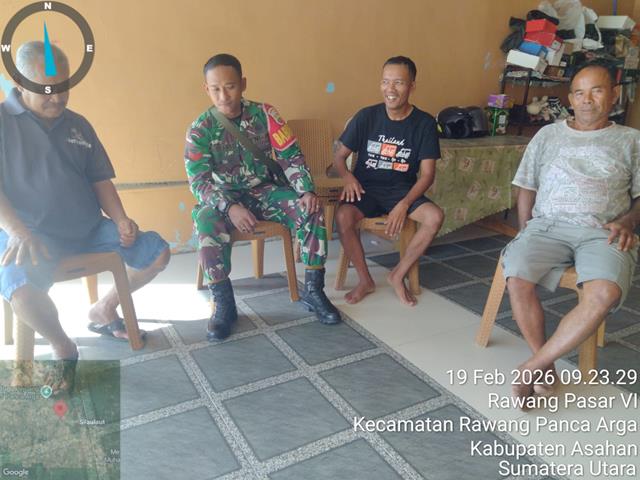 Asahan  |  Dengan terjalinnya silaturahmi yang baik akan meningkatkan hubungan kerja yang baik antara Babinsa dengan komponen masyarakat yang ada di wilayahnya dan akan meningkatkan kepercayaan masyarakat kepada Babinsa, dalam kesempatan ini seperti yang dilakukan oleh Personel Bintara Pembina Desa (Babinsa) Koramil 18/Meranti jajaran Kodim 0208/Asahan Koptu Julianto turun kewilayah binaan untuk turut serta melaksanakan kegiatan Komunikasi Sosial (Komsos) bersama dengan warga binaan masyarakat, dengan harapan Babinsa agar tetap terjalin komunikasi yang baik sebagai silahturahmi kekeluargaan dan menambah semangat dalam bekerja dengan masyarakat membicarakan tentang perkembangan situasi sekarang, kegiatan Komsos dengan warga Bapak Wamildon Sinaga (Warga), Bapak Sofyan Sinaga (warga) dan Bapak Budi (Warga), kegiatan tersebut yang dilaksanakan bertempat di Desa Rawang Lama Kecamatan Rawang Panca Arga Kabupaten Asahan, Kamis (19/02/2026).