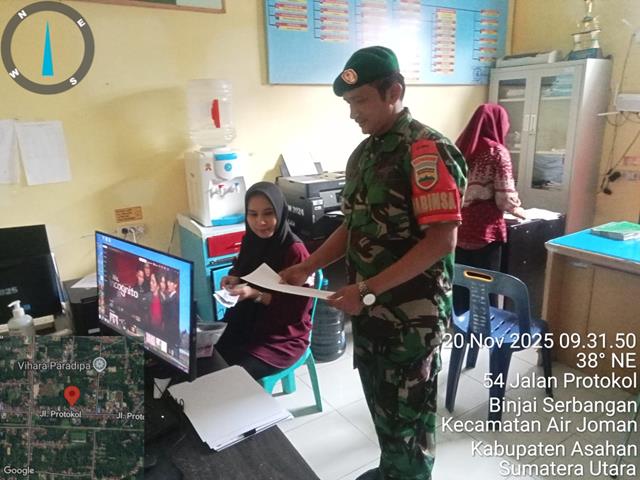 Dalam kesempatan ini seperti yang dilakukan oleh Personel Bintara Pembina Desa (Babinsa) Koramil 07/Air Joman jajaran Kodim 0208/Asahan Sertu A Barus turun kewilayah binaan untuk melaksanakan kegiatan Puanter di Puskesmas, kegiatan puanter pendataan warga yang berobat di puskesmas pembantu, kegiatan Puanter di Puskesmas, giat Bakti TNI dengan pendataan ke Puskesmas Air Joman, kegiatan Babinsa dalam hal ini melaksanakan pendataan anak” Stunting kepada petugas yang berada di Puskesmas Binjai Serbangan dan pendataan ketersediaan obat²an yang ada di Puskesmas Air Joman, dalam giat tersebut Babinsa juga selalu berkoordinasi dan bekerja sama dgn pihak puskesmas Binjai Serbangan untuk selalu memberi bantuan  terkait dengan anak² Stunting di wilayah binaan, giat tersebut sekaligus menjalin tali silaturrahmi antara Babinsa dengan petugas Puskesmas Binjai Serbangan, bersama dengan Ibu Eli (Staf Puskesmas), Ibu Ratna Sgn (Staf Puskesmas) dan Ibu Dian (Masyarakat), kegiatan tersebut yang dilaksanakan bertempat di Jalan Protokol Kelurahan Binjai Serbangan Kecamatan Air Joman Kabupaten Asahan, Kamis (20/11/2025).