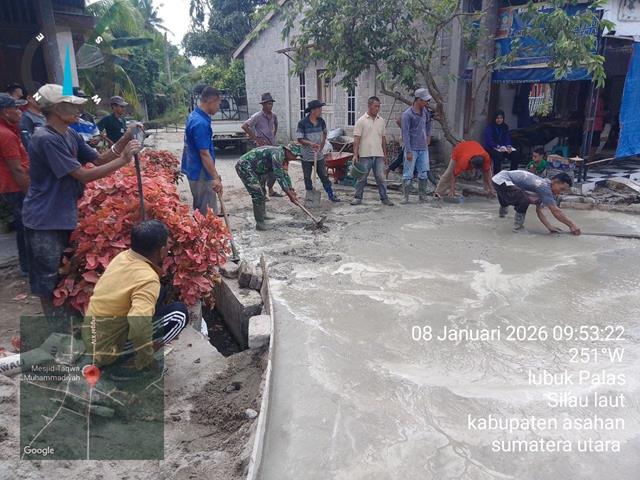 Selalu hadir di tengah-tengah warga masyarakat binaan, dalam kesempatan ini seperti halnya yang dilakukan oleh Personel Bintara Pembina Desa (Babinsa) Koramil 07/Air Joman jajaran Kodim 0208/Asahan Kopka Rudi turun kewilayah desa binaan untuk turut serta melaksanakan kegiatan Gotong Royong bersama Warga Mengecor Jalan diwilayah tersebut, kegiatan Komsos sekaligus membantu warga yang sedang mengecor jalan untuk akses jalan kewilayah tersebut, gotong royong membantu masyarakat pengecoran akses jalan, kegiatan Gotong royong mengecor jalan bersama dengan masyarakat, bersama dengan Bapak Pangaribuan (Kadus 3), Bapak Guntur (Kadus 4) dan warga masyarakat Desa Lubuk Palas, kegiatan tersebut yang dilaksanakan bertempat di Desa Lubuk Palas Dusun III Desa lubuk Palas Kecamatan Silau Laut Kabupaten Asahan, Kamis (08/01/2026).