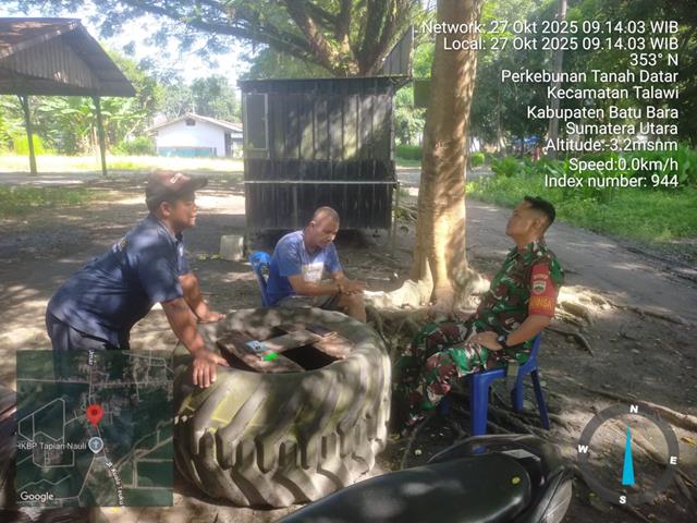 Batu Bara | Dalam rangka untuk memelihara dan menjalin hubungan baik Antara Babinsa Apratur Desa, untuk meningkatkan rasa kepedulian terhadap masyarakat dan untuk menciptakan Kemanunggalan TNI dengan Rakyat, Keamanan lingkungan diwilayah sebuah perusahaan tidak terlepas dari peran para security atau satpam dalam menjaga keamanan, baik diluar dan didalam lokasi perusahaan itu sendiri, dalam kesempatan ini seperti yang dilakukan oleh Personel Bintara Pembina Desa (Babinsa) Koramil 04/Talawi jajaran Kodim 0208/Asahan Serma Indra Kurniawan turun kewilayahbinaan untuk melaksanakan kegiatan Komunikasi Sosial (Komsos) dan Silaturahmi bersama dengan Karyawan PT. SMA dan Masyarakat Perk. Tanah Datar tentang agar tetap menjaga kesehatan, keamanan dan ketertiban lingkungan, bersama dengan Bapak Sariadi (Karyawan) dan Bapak Ridwan (Polmas), kegiatan tersebut yang dilaksanakan bertempat di Dusun I Desa Perk.Tanah Datar Kecamatan Datuk Tanah Datar Kabupaten Batu Bara, Senin (27/10/2025).