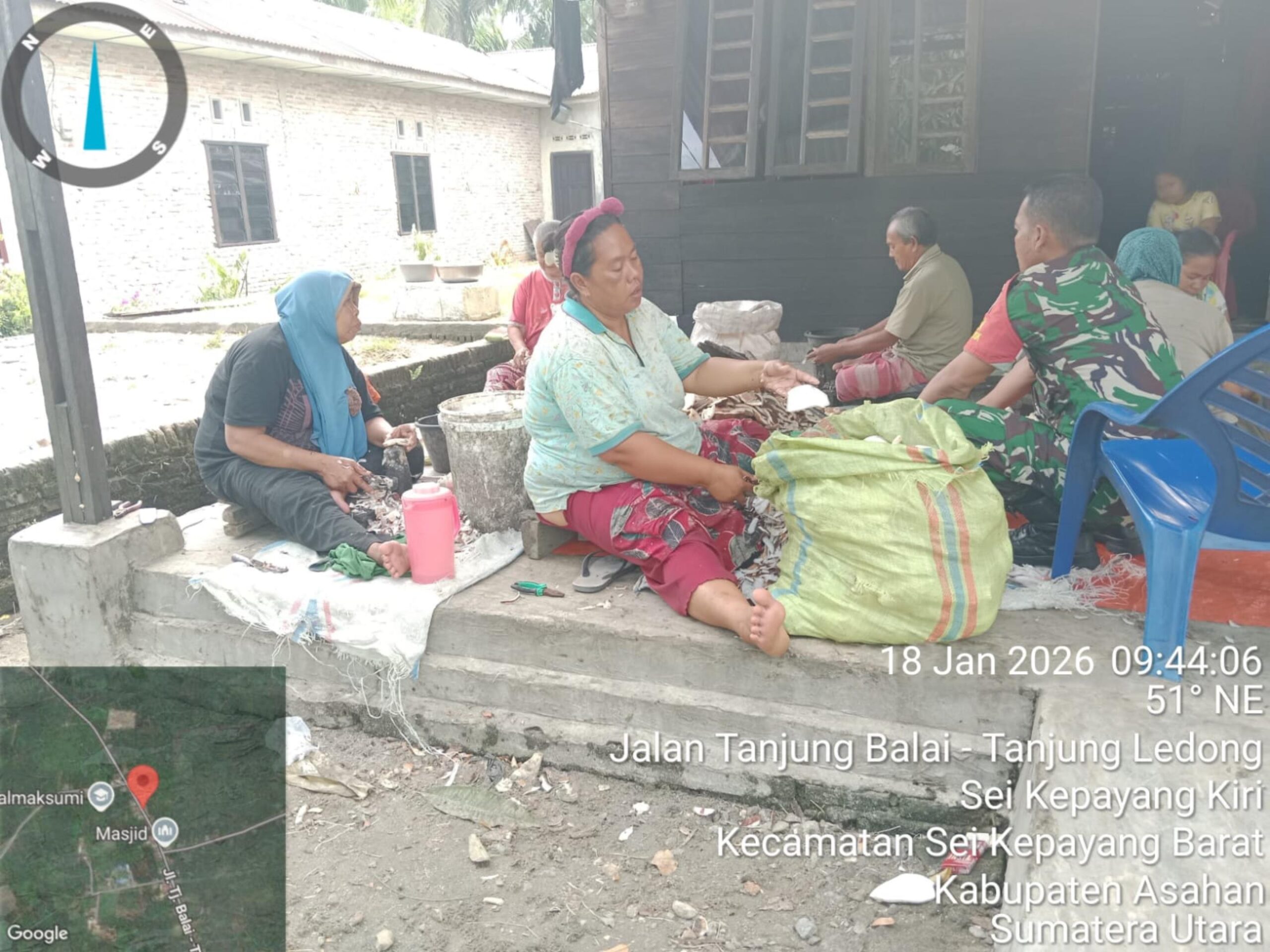 Asahan | Rutinitas Komsos yang dilakukan Babinsa di wilayah, merupakan salah satu sarana yang paling mudah bagi Babinsa untuk dapat mempererat tali silaturahmi dan menjaga hubungan yang baik dengan seluruh lapisan masyarakat di wilayah binaan, dalam kesempatan ini seperti yang dilakukan oleh Personel Bintara Pembina Desa (Babinsa) Koramil 10/Sei Kepayang jajaran Kodim 0208/Asahan Koptu MD Sihombing turun kewilayah binaan untuk melaksanakan kegiatan Komunikasi Sosial (Komsos) bersama dengan Warga Masyarakat yang sedang bekerja mencungkil kelapa kopra Babinsa mengajak Warga agar tetap menjaga kesehatan dan keselamatan kerja, kegiatan komsos dengan Masyarakat Desa Sei Kepayang Kiri Bapak Sangkot, Ibu Heny, Ibu Neti dan Ibu Usna, kegiatan tersebut yang dilaksanakan bertempat di Desa Sei Kepayang Kiri Kecamatan Sei Kepayang Kabupaten Asahan, Minggu (18/01/2026).