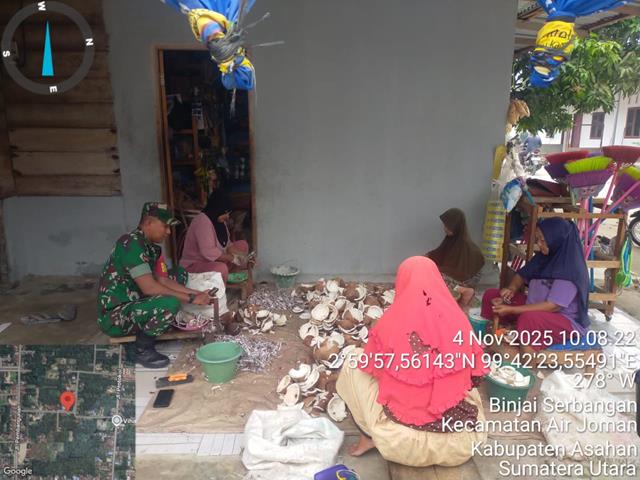 Asahan  |  Rutinitas Komsos yang dilakukan Babinsa di wilayah, merupakan salah satu sarana yang paling mudah bagi Babinsa untuk dapat mempererat tali silaturahmi dan menjaga hubungan yang baik dengan seluruh lapisan masyarakat di wilayah binaan, dalam kesempatan ini seperti yang dilakukan oleh Personel Bintara Pembina Desa (Babinsa) Koramil 07/Air Joman jajaran Kodim 0208/Asahan Kopda Hambi Jaya turun kewilayah binaan untuk melaksanakan kegiatan Komunikasi Sosial (Komsos) bersama dengan Warga Masyarakat yang sedang bekerja mencungkil kelapa kopra Babinsa mengajak Warga agar tetap menjaga kesehatan dan keselamatan kerja, Komsos dirumah ibu Jamiah, tempat pengupasan buah kelapa, Bersama dengan Ibu Jamiah, Ibu Marni, Ibu Besti dan Ibu Ros, kegiatan tersebut yang dilaksanakan bertempat di Kelurahan Binjai Serbangan Lingkungan 5 Kecamatan Air Joman Kabupaten Asahan, Selasa (04/11/2025).