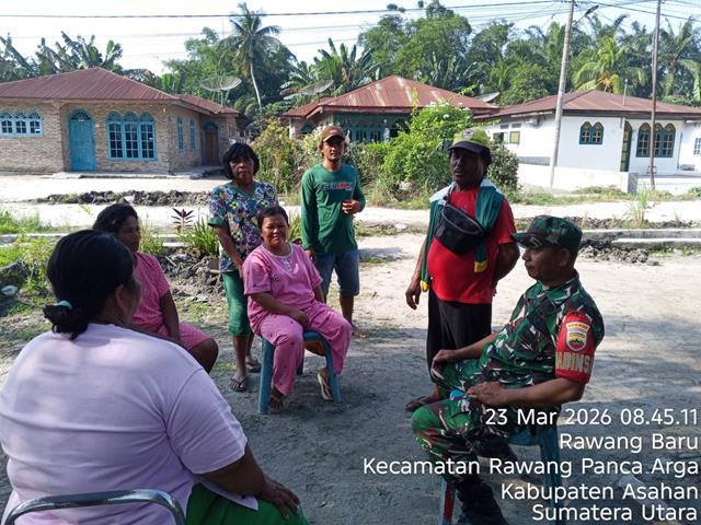 Asahan | Dalam rangka untuk menjalin komunikasi yang baik antara Babinsa dan semua lapisan masyarakat yang ada diwilayah binaan, dalam kesempatan tersebut seperti yang dilakukan oleh Personel Bintara Pembina Desa (Babinsa) Koramil 18/Meranti jajaran Kodim 0208/Asahan Serda Adong Rajagugguk turun kewilayah binaan untuk melaksanakan kegiatan Komunikasi Sosial (Komsos) sekaligus Anjangsana bersama dengan warga binaan guna membahas tentang keamanan dan kebersihan lingkungan, kegiatan Komsos dengan warga Desa Binaan, kegiatan Komsos bertujuan untuk bersilaturahmi dengan warga agar Babinsa mengenal lebih dekat dengan warga binaan sekaligus menanyak kan situasi ke amanan selama di hari Raya Idul Fitri sehingga tercipta hubungan yang humanis antara Babinsa dan seluruh warga dan Babinsa senantiasa menghimbau agar tetap menjaga kerukunan antar umat beragama dalam pelaksanaan hari raya idul Fitri dan toleransi kepada seluruh lapisan masyarakat, bersama dengan Bapak Rustom (Kadus Dusun 1), Ibu Riana (warga) dan Ibu Mira (warga), kegiatan tersebut yang dilaksanakan bertempat di Desa Rawang Baru Kecamatan Rawang Baru Panca Arga Kabupaten Asahan, Senin (23/03/2026).
