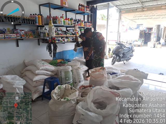 Kebutuhan Pupuk an Organik oleh petani di Desa binaan pada umumnya masih belum bisa meninggalkan pupuk an organik untuk memupuk tanaman khususnya padi dan belum bisa 100% untuk menggunakan pupuk organik oleh karena itu untuk mengetahui kebutuhan pupuk di wilayah binaan, dalam kesempatan ini seperti yang dilakukan oleh Personel Bintara Pembina Desa (Babinsa) Koramil 07/Air Joman jajaran Kodim 0208/Asahan Serka Fery Rudiyanto turun kewilayah binaan untuk melaksanakan kegiatan Komunikasi Sosial (Komsos) bersama dengan warga masyarakat binaan, pendataan pupuk milik Ibu Sugiati, kegiatan yang dilakukan Babinsa yaitu melaksanakan pendataan pupuk yg saat ini ada digudang Ibu Sugiani untuk sekarang ini pupuk Cukup untuk disalurkan kepada petani sehingga besar harapan petani pd saat panen tiba bisa menghasilkan gabah/padi yang melimpah dan berkualitas, sehingga kegiatan ini dpt mendukung program pemerintah tentang ketahanan pangan dan swasembada pangan, kegiatan tersebut yang dilaksanakan bertempat di Dusun 3 Desa Punggulan Kecamatan Air Joman Kabupaten Asahan, Rabu (04/02/2026).