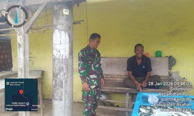 Asahan  |  Dengan melaksanakankegiatan Komsos bersama warga Kelurahan yang hadir dalam kegiatan ini menyambut baik inisiatif Babinsa dan berharap agar kegiatan serupa dapat terus dilakukan, “Kami sangat menghargai upaya Babinsa dalam membangun hubungan yang baik dengan masyarakat, semoga kegiatan ini dapat memperkuat hubungan dan meningkatkan kesadaran warga dalam menjaga kamtibmas, dalam kesempatan ini seperti yang dilakukan oleh Personel Bintara Pembina Desa (Babinsa) Koramil 18/Meranti jajaran Kodim 0208/Asahan Serka Jevi Rahman Siahaan turun kewilayah binaan untuk turut serta melaksanakan kegiatan Komunikais Sosial (Komsos) bersama dengan Warga masyarakat binaan, kegiatan Komsos dengan warga Bapak Anto, sekaligus sebagai sarana untuk memonitor segala perkembangan yang terjadi ditengah tengah masyarakat, kegiatan tersebut yang dilaksanakan bertempat di Desa Sidomulyo Kecamatan Pulo Bandring Kabupaten Asahan, Rabi (28/01/2026).
