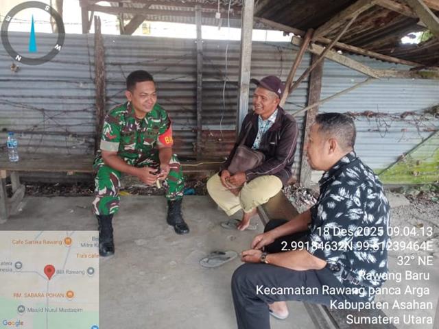 Asahan | Komunikasi sosial yang dilakukan ini merupakan wadah silahturahmi dengan Masyarakat sekitar, yang dapat memupuk kebersamaan dan menimbulkan rasa saling hormat menghormati antara sesama di wilayah binaan. Pentingnya silahturahmi dengan para tokoh masyarakat diwilayah binaan merupakan suatu bentuk kedekatan aparat pemerintah dengan warganya, dalam kesempatan tersebut seperti yang dilakukan oleh Personel Bintara Pembina Desa (Babinsa) Koramil 18/Meranti jajaran Kodim 0208/Asahan Kopda Dedi Susanto turun kewilayah binaan untuk melaksanakan kegiatan Komunikasi Sosial (Komsos) bersama dengan warga Masyarakat membahas tentang Keamanan dan ketertiban lingkungan dan menghimbau Masyarakat desa binaan agar selalu menjaga situasi kamtibmas, kebersihan tempat tinggal dan hubungan silaturahmi yang harmonis sesama warga agar selalu hidup rukun dan damai, Komsos dengan warga masyarakat Bapak S Sitorus (warga Dusun Vl) dan Bapak J Silaban (warga Dusun Vl), kegiatan tersebut yang dilaksanakan bertempat di Dusun Vl Desa Rawang Baru Kecamatan Rawang Panca Arga Kabupaten Asahan, Kamis (18/12/2025).