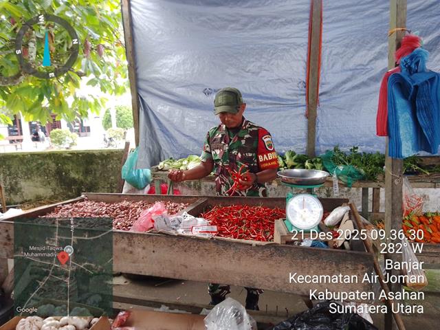 Asahan  |  Komsos tersebut bertujuan untuk melakukan pengecekan terhadap harga bahan pokok sekaligus memastikan ketersediaan stok bahan pokok untuk kebutuhan warga masyarakat, dalam kesempatan ini seperti yang dilakukan oleh Personel Bintara Pembina Desa (Babinsa) Koramil 07/Air Joman jajaran Kodim 0208/Asahan Kopka  Rudi  turun kewilayah binaan untuk melaksanakan kegiatan Gotong royong bersama masyarakat dalam pembenahan membuat rumah warga desa binaan selaku mitra karib yang ada diwilayah binaan, kegiatan pengecekan Harga kebutuhan bahan pokok pendataan harga2 bahan pokok disalah satu grosir milik Bapak Awaludin, kegiatan tersebut yang dilaksanakan bertempat di Dusun 3 Desa Lubuk Palas Kecamatan Silau Laut Kabupaten Asahan, Minggu (21/12/2025).