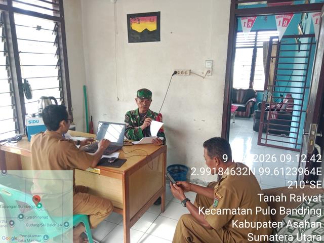 Asahan  |  Dalam rangka untuk mensukseskan tugas-tugas pemerintah yang ada diwilayah binaan serta meperbaharui data kewilayahan, dalam kesempatan ini seperti yang dilakukan oleh Personel Bintara Pembina Desa (Babinsa) Koramil 18/Meranti jajaran Kodim 0208/Asahan Serka A B Tambunan turun kewilayah desa binaan untuk melaksanakan kegiatan Pul Data Ter bersama Aparatur Pemerintahan dengan melaksanakan Pul Data Ter pengecekan Geo Demo Komsos, kegiatan Pul data Ter dengan Kaur Desa, dan Kadus di kantor desa, kegiatan Komsos bertujuan untuk bersilaturahmi dengan aparatur desa sekaligus mendata warga yang baru masuk ber domisili di desa binaan dan agar babinsa lebih dekat dengan warga binaan sehingga tercipta hubungan yang humanis antara babinsa dan seluruh warga dan Babinsa senantiasa menghimbau agar tetap menjaga kerukunan antar umat beragama dalam pelaksanaan bulan suci Ramadhan dan toleransi kepada seluruh lapisan  masyarakat, bersama dengan Bapak Sekdes Tanah Rakyat dan Saudara Kaur Humas, kegiatan tersebut yang dilaksanakan bertempat di Kantor  Desa Tanah Rakyat Keamatan Meranti Kabupaten Asahan, Senin (09/03/2026).