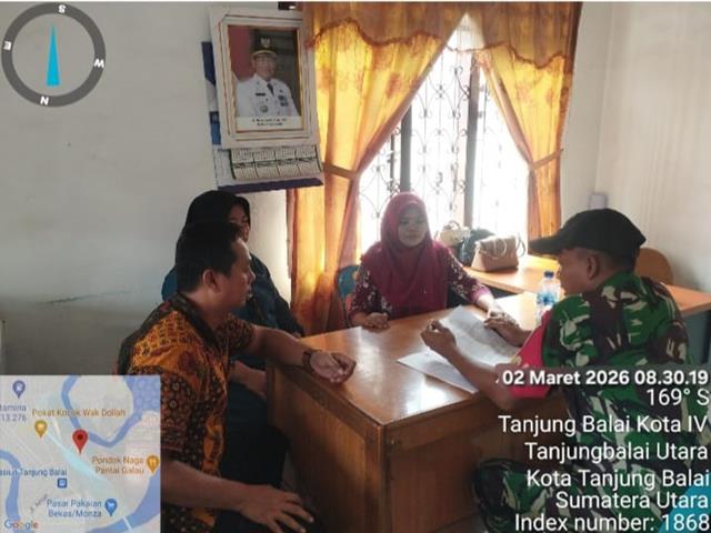 Tanjung Balai  |  Dengan aktif melaksanakan kegiatan ini diyakini mampu meningkatkan kerjasama dengan Perangkat Desa binaan guna menjaga keamanan dan ketentraman dimasyarakat, dalam rangka untuk mensukseskan tugas-tugas pemerintah yang ada diwilayah binaan serta meperbaharui data kewilayahan, dalam kesempatan ini seperti yang dilakukan oleh Personel Bintara Pembina Desa (Babinsa) Koramil 09/Tanjung Balai jajaran Kodim 0208/Asahan Kopda M Sutejo turun kewilayah desa binaan untuk melaksanakan kegiatan Pul Data Ter sekaligus melaksanakan kegiatan Anjangsana dengan perangkat Kelurahan, kegiatan Puldatater di kantor kelurahan guna untuk mengetahui perubahan data-data yang ada di wilayah sekaligus menjalin silaturahmi antara babinsa dengan aparat kelurahan, bersama dengan Kasi kesos Kelurahan Tanjung Balai Kota IV Ibu Satiem, Kasi pemasyarakatan Kelurahan Tanjung Balai Kota IV Bapak Mardianto dan Kepling III Kelurahan Tanjung Balai Kota IV Bapak Anwar, kegiatan tersebut yang dilaksanakan bertempat di Jalan Esdengki Kelurahan Tanjung Balai Kota IV Kecamatan Tanjung Balai Utara Kota Tanjung Balai, Senin (02/03/2026).