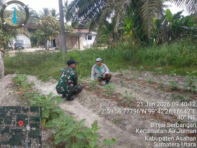 Dalam rangka untuk meningkatkan hasil panen, dengan pendampingan dan saran dari Babinsa, diharapkan petani dapat meningkatkan hasil panen terong mereka, baik dari segi kuantitas maupun kualitas, dalam kesempatan ini seperti yang dilakukan oleh Personel Bintara Pembina Desa (Babinsa) Koramil 07/Air Joman jajaran Kodim 0208/Asahan Kopda Hambi Jaya turun kewilayah desa binaan untuk turut serta melaksanakan kegiatan mengunjungi petani terong dikebunnya, dengan melaksanakan kegiatan Puanter di lahan milik Bapak Suyatno, kegiatan Babinsa kali ini memantau sekaligus mendata lahan yang akan di jadikan lahan tanaman terong seluas 4 rante, pendampingan Babinsa terhadap petani terong yaitu membantu membersihkan gulma/rumput serta memberikan motivasi dan mendorong para petani untuk tetap semangat dalam melakukan perawatan secara rutin dengan membersihkan tanaman dari rumput liar yang dapat menggangu pertumbuhan tanaman, sehingga dimasa panen nantinya dapat menghasil buah yang memuaskan, kegiatan tersebut yang dilaksanakan bertempat di Lingkungan VI Kelurahan Binjai Serbangan Kecamatan Air Joman Kabupaten Asahan, Rabu (21/01/2026).