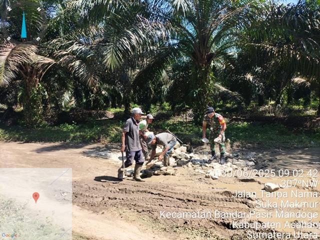 Asahan | Dalam rangka pelaksanaan kegiatan Marharoan Bolon bersama perangkat desa dan masyarakat, hal ini menyebabkan masyarakat sangat antusias dalam setiap suatu kegiatan karena Babinsa selalu ada ditengah-tengah mereka sehingga diharapkan jalinan kerjasama tersebut putus dan terus menerus dapat terjalin dengan baik, dalam kesempatan ini seperti yang dilakukan oleh Personel Bintara Pembina Desa (Babinsa) Koramil 14/Bandar Pasir Mandoge jajaran Kodim 0208/Asahan Serda Suheriyono turut serta melaksanakan kegiatan Gotong royong bersama masyarakat membantu memperbaiki dan menimbun jalan yang berlobang dalam kegiatan tersebut diharapkan dapat mempererat hubungan kekompakan dan kemanunggalan TNI dengan rakyat sekaligus untuk menumbuhkan rasa saling tolong menolong bersama masyarakat melaksanakan gotong royong memperbaiki jalan yang berlubang agar masyarakat dapat melintasi jalan tersebut dengan aman dan terhindar dari hal-hal yang tak diinginkan, kegiatan tersebut diharapkan dapat mempererat hubungan kekompakan dan keharmonisan dalam menunjang tugas pokok TNI agar semakin dicintai Rakyat, bersama dengan Bapak Ahmad, Bapak Anto Sinurat, Bapak Legimen dan Bapak Jery Manurung, kegiatan tersebut yang dilaksanakan bertempat di Dusun Vl Desa Suka Makmur Kecamatan Bandar Pasir Mandoge Kabupaten Asahan, Selasa (01/07/2025).