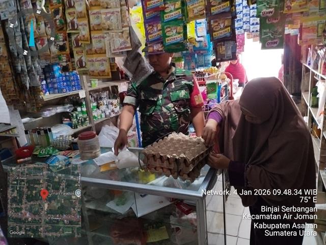 Asahan | Dalam kesempatan ini Komsos sekaligus cek harga sembako merupakan berkurangnya pasokan bahan makanan, yang dilakukannya itu sebagai bentuk dan peran setiap personel dalam mengayomi dan menjaga masyarakat, dalam kesempatan ini seperti halnya yang dilakukan oleh Personel Bintara Pembina Desa (Babinsa) Koramil 07/Air Joman jajaran Kodim 0208/Asahan Sertu Dahrum turun kewilayah binaan untuk melaksanakan kegiatan Komunikasi Sosial (Komsos) bersama masyarakat memantau tentang kestabilan harga bahan pokok, dengan melaksanakan Puanter yaitu pendataan harga sembako di warung Ibu Yuni, kegiatan Babinsa dalam hal ini mendata dan memantau harga sembako yang ada di wilayah desa Binaan, dari hasil pantauan harga sejumlah kebutuhan pokok terpantau relatif stabil, meskipun ada beberapa komoditas yang mengalami sedikit kenaikan karena faktor distribusi dan cuaca, kegiatan ini juga dapat memperat hubungan silaturahmi antara Babinsa dan masyarakat binaan, kegiatan pengecekan harga bahan pokok tersebut yang dilaksanakan bertempat di Lingkungan 6 Kelurahan Binjai Serbangan Kecamatan Air Joman Kabupaten Asahan, MInggu (04/01/2026).