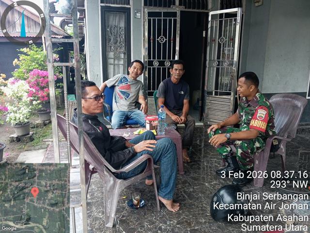 Asahan | Agar terjalinnya tali silaturahmi dan hubungan yang harmonis antara Babinsa dengan masyarakat serta menghimbau agar menjaga kesehatan terhadap warga Desa binaan, dalam kesempatan ini seperti yang dilakukan oleh Personel Bintara Pembina Desa (Babinsa) Koramil 07/Air Joman jajaran Kodim 0208/Asahan Sertu Wagito turun kewilayah binaan untuk melaksanakan kegiatan Komunikasi Sosial (Komsos) bersama dengan warga Masyarakat binaan, untuk tujuan menghimbau para remaja agar turut serta berperan di lingkungan masyarakat seperti gotong royong, dengan melaksanakan Komunikasi Sosial dengan warga binaan dalam menciptakan Kamtibmas, bersama dengan Bapak Paiman (Pemilik rumah), Bapak Tukino dan Bapak Saiman, kegiatan tersebut yang dilaksanakan bertempat di Rumah Bapak Paiman Lingkungan XI Kelurahan Binjai Serbangan Kecamatan Air Joman Kabupaten Asahan, Selasa (03/02/2026).