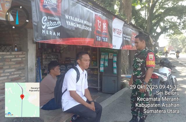 Asahan  |  Dalam rangka untuk menciptakan dan meningkatkan kerja sama yang baik, dan menjaga silatuhrahmi  antara TNI dan masyarakat, untuk menciptakan kemanunggalan TNI dan Rakyat serta dalam rangka agar terjalinnya tali silaturahmi dan hubungan yang harmonis antara Babinsa dengan masyarakat diwilayah desa binaan, dalam kesempatan ini seperti yang dilakukan oleh Personel Bintara Pembina Desa (Babinsa) Koramil 18/Meranti jajaran Kodim 0208/Asahan Serka Jevi Rahman Siahaan turun kewilayah binaan untuk melaksanakan kegiatan Komunikasi Sosial (Komsos) bersama dengan warga masyarakat binaan, Komsos dengan masyarakat binaan desa Sei Beluru dalam rangka silaturahmi Babinsa kepada masyarakat binaan untuk menjalin hubungan yang baik dan humanis antara masyarakat dan Babinsa, bersama dengan Bapak Andre, Bapak maahruf Nasution dan Ibu Ida.