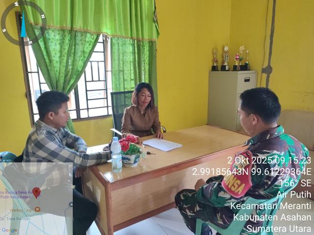 Asahan  |  Dalam rangka untuk menciptakan dan meningkatkan kerja sama yang baik serta menjalin hubungan antara TNI dan aparatur desa serta untuk menciptakan kemanunggal TNI dengan Rakyat, dalam kesempatan tersebut seperti hal yang dilakukan oleh Personel Bintara Pembina Desa (Babinsa) Koramil 18/Meranti jajaran Kodim 0208/Asahan Kopda Rahmat Saleh turun kewilayah binaan untuk melaksanakan kegiatan Komunikasi Sosial (Komsos) bersama dengan perangkat Desa untuk menjalin silaturahim antara Babinsa dan aparat Desa dan untuk mengetahui permasalahan yang ada diwilayah desa binaan, Komsos dengan perangkat Desa dalam rangka menjalin kerjasama anatar babinsa dan aparatur desa binaan dan sebagai informasi pertahanan dan keamanan Desa, bersama dengan Bapak Fredi Sirait (Kaur Umum), Bapak Hendri Sirait (Kadus 3), Bapak Johanes Simangunsong (Kadus 1) dan Ibu Eni Jayati (Kasi Operator), kegiatan tersebut yang dilaksanakan bertempat di Desa Air Putih Kecamatan Meranti Kabupaten Asahan, Kamis (02/10/2025).
