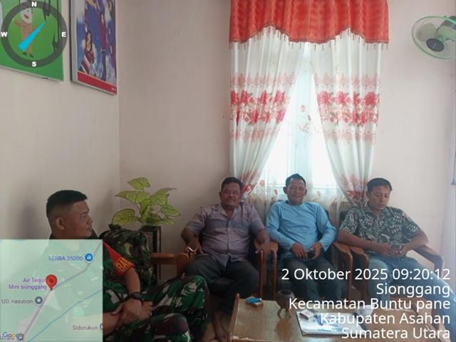 Asahan  |  Komunikasi sosial yang dilakukan merupakan wadah silahturahmi antara Babinsa dengan tokoh Masyarakat sekitar, yang dapat memupuk kebersamaan dan menimbulkan rasa saling hormat menghormati antar sesama di wilayah Binaan, pentingnya Silahturahmi dengan tokoh-tokoh masyarakat di wilayah binaan merupakan suatu bentuk kedekatan kita dengan warga, dalam kesempatan ini seperti yang dilakukan oleh Personel Bintara Pembina Desa (Babinsa) Koramil 13/Buntu Pane jajaran Kodim 0208/Asahan Serda Jasem turun kewilayah desa binaan untuk melaksanakan kegiatan Komunikasi Sosial (Komsos) bersama dengan Tokoh masyarakat dan warga masyarakat binaan, kegiatan Komsos dengan Tokoh Masyarakat guna menjalin hubungan Silaturahmi yang Harmonis antara Babinsa dan Masyarakat untuk dapat membantu kegiatan Babinsa dalam Temu Cepat Lapor cepat, sehingga perkembangan situasi di Desa binaan dapat terpantau dengan baik, bersama dengan Bapak Dedi, Bapak Darmin Simbolon dan Bapak Leman Panjaitan, kegiatan tersebut yang dilaksanakan bertempat di Dusun 1 Desa Sionggang Kecamatan Buntu Pane Kabupaten Asahan, Kamis (02/10/2025).