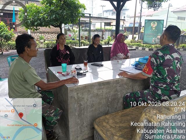 Asahan  |  Dalam rangka untuk memelihara dan menjalin hubungan baik dengan masyarakat, untuk meningkatkan sinergitas antara TNI dan masrakat, keakraban kepada warga binaan merupakan tugas pokok Babinsa. Salah satunya yaitu dengan melakukan komunikasi sosial dalam menciptakan interaksi serta kekompakan antara Babinsa dan warga binaannya. Inilah yang dilakukan oleh para Babinsa diwilayah binaan, dalam kesempatan ini seperti yang dilakukan oleh Personel Bintara Pembina Desa (Babinsa) Koramil 16/Pulau Rakyat jajaran Kodim 0208/Asahan Serma KD Sitorus dan 1 anggota Babinsa turun kewilayah binaan untuk melaksanakan kegiatan Komunikasi Sosial (Komsos) bersama dengan warga masyarakat Desa binaan, kegiatan Komunikasi Sosial bersama masyarakat, guna menyampaikan semangat ikut lomba dan hadir dalam kegiatan TNI Prima Run di Kodim 0208/Asahan kepada warga desa binaan, bersama dengan Bapak Herman, Ibu Zulaiha dan Serliana, kegiatan tersebut yang dilaksanakan bertempat di Dusun 1 Desa Pulau Rakyat Tua dan warga Kecamatan Rahuning Kabupaten Asahan, Jumat (10/10/2025).