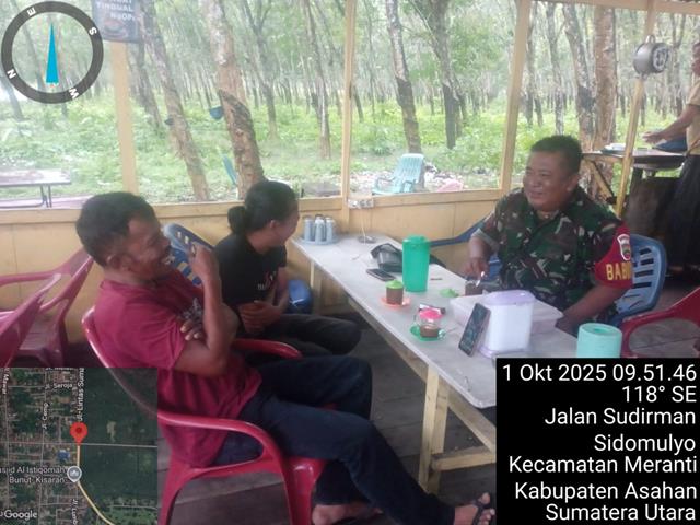 Asahan  |  Dalam rangka untuk memelihara dan menjalin hubungan baik dengan masyarakat, untuk meningkatkan sinergitas antara TNI dan masrakat, keakraban kepada warga binaan merupakan tugas pokok Babinsa. Salah satunya yaitu dengan melakukan komunikasi sosial dalam menciptakan interaksi serta kekompakan antara Babinsa dan warga binaannya. Inilah yang dilakukan oleh para Babinsa diwilayah binaan, dalam kesempatan ini seperti yang dilakukan oleh Personel Bintara Pembina Desa (Babinsa) Koramil 18/Meranti jajaran Kodim 0208/Asahan Pelda Sofyan turun kewilayah binaan untuk melaksanakan kegiatan Komunikasi Sosial (Komsos) bersama dengan warga masyarakat Desa binaan, dengan melaksanakan kegiatan Komsos merupakan sarana agar babinsa lebih  mengenal lebih dekat dengan warga binaan sehingga tercipta hubungan yang humanis antara babinsa dan seluruh warga, kegiatan komsos dengan warga Bapak Nanang dan Bapak Ngatino, kegiatan tersebut yang dilaksanakan bertempat di Desa Bunut Seberang Kecamatan Pulo Bandring Kabupaten Asahan, Rabu (01/10/2025).