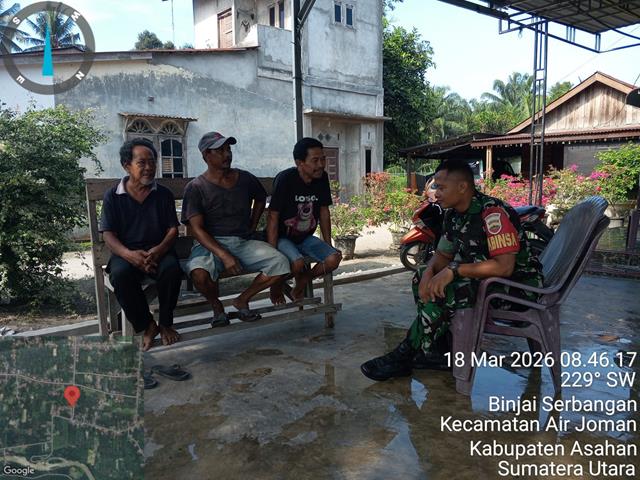Asahan | Dengan terjalinnya silaturahmi yang baik akan meningkatkan hubungan kerja yang baik antara Babinsa dengan komponen masyarakat yang ada di wilayahnya dan akan meningkatkan kepercayaan masyarakat kepada Babinsa, dalam kesempatan ini seperti yang dilakukan oleh Personel Bintara Pembina Desa (Babinsa) Koramil 07/Air Joman jajaran Kodim 0208/Asahan Sertu Wagito turun kewilayah binaan untuk turut serta melaksanakan kegiatan Komunikasi Sosial (Komsos) bersama dengan warga binaan masyarakat, dengan harapan Babinsa agar tetap terjalin komunikasi yang baik sebagai silahturahmi kekeluargaan dan menambah semangat dalam bekerja dengan masyarakat membicarakan tentang perkembangan situasi sekarang, dengan melaksanakan Komunikasi Sosial dengan warga binaan ditempat pencucian sepeda motor milik Bapak Paiman, bersama dengan Bapak Ahmad dan Bapak Risman, kegiatan tersebut yang dilaksanakan bertempat di Kelurahan XI Kelurahan Binjai Serbangan Kecamatan Air Joman Kabupaten Asahan, Rabu (18/03/2026).