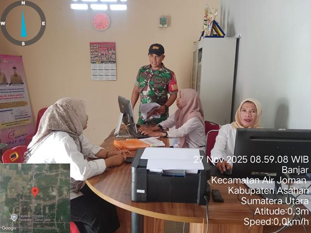 Asahan | Dalam rangka untuk menjalin silatuhrahmi dan kerjasama yang baik dengan Pegawai Kesehatan yang ada diwilayah desa binaan, dalam kesempatan ini seperti yang dilakukan oleh Personel Bintara Pembina Desa (Babinsa) Koramil 07/Air Joman jajaran Kodim 0208/Asahan Sertu Dahrum turun kewilayah binaan untuk melaksanakan kegiatan Komunikasi Sosial (Komsos) bersama dengan pegawai Dinas Kesehatan dalam rangka untuk melaksanakan pendataan anak Stunting yang menjadi tanggung jawab bersama dan harus mengalami penurunan, giat Bakti TNI dengan pendataan ke Puskesmas Pembantu Desa Banjar, kegiatan Babinsa dalam hal ini melaksanakan pendataan anak” Stunting kepada petugas yg berada di Puskesmas Pembantu Desa Banjar dan pendataan ketersediaan obat²an yg ada di Puskesmas Pembantu Desa Banjar, bersama dengan Ibu Ida (petugas Puskesmas), Ibu Rani (staf Puskesmas) dan Ibu Resti (staf Puskesmas), kegiatan pendataan Stunting tersebut yang dilaksanakan berlokasi di Jalan Syekh Silau Dusun 2A Desa Banjar Kecamatan Air Joman Kabupaten Asahan, Kamis (27/11/2025).