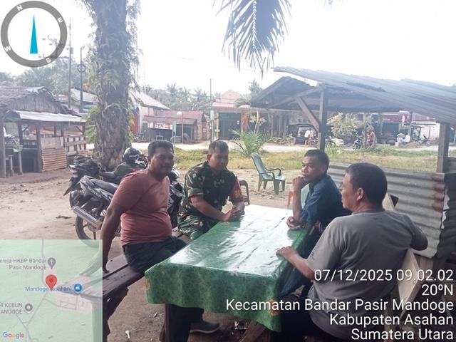 Agar terjalin nya hubungan baik Antara Babinsa dengan Warga masyarakat untuk menunjang Tupoksi Apter, dalam kesempatan ini seperti yang dilakukan oleh Personel Bintara Pembina Desa (Babinsa) Koramil 14/Bandar Pasir Mandoge jajaran Kodim 0208/Asahan Kopda Suyanto turun kewilayah binaan untuk melaksanakan Komunikasi Sosial (Komsos) bersama warga masyarakat dalam rangka membicarakan tentang Kamtibmas diwilayah desa binaan, bersama masyarakat melaksanakan komsos membahas Pos Kamling agar tetap aktif supaya tetap terjaga keamanan dan ketertiban di Desa. Kegiatan ini dilaksanakan guna membangun kebersamaan antara TNI dan masyarakat dalam menjaga keamanan sehingga suasana tetap kondusif, bersama dengan Bapak Sidik Panjaitan, Bapak Rudianto dan Bapak Leo Sinurat, kegiatan tersebut yang dilaksanakan bertempat di dusun I Desa Bandar Pasir Mandoge Kecamatan Bandar Pasir Mandoge Kabupaten Asahan, Minggu (07/12/2025).
