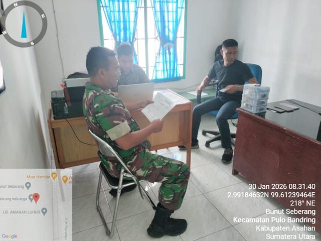 Asahan  |  Dalam rangka membicarakan tentang Pendataan Jumlah Penduduk yang baru pindah dan yang telah meninggal dunia untuk perbaharuan data, pada kesempatan tersebut Babinsa dapat mengetahui jumlah penduduk yang baru dan meninggal dunia di setiap Desa binaan, dalam kesempatan ini seperti yang dilakukan oleh Personel Bintara Pembina Desa (Babinsa) Koramil 18/Meranti jajaran Kodim 0208/Asahan Serda Saleh Pohan turun kewilayah binaan untuk melaksanakan kegiatan Pul Data Ter diwilayah di desa binaan, agar terjalin hubungan yang erat antara Babinsa dan perangkat desa, kegiatan Pengumpulan Data Teritorial (Puanter) bersama aparat pemerintah desa (Appem) dalam rangka pendataan jumlah penduduk, dengan melaksanakan puanter dengan perangkat Desa Bunut Seberang adapun maksud dan tujuan, untuk menyampaikan supaya aparatur Desa Bunut Seberang meningkatkan pelayanan bagi masyarakat Desa Bunut Seberang dan berkoordinasi terkait tertib Administrasi Desa, bersama dengan Bapak  Rido (Bendahara desa  Bunut Seberang) dan Bapak Legiadi (Kaur Desa Bunut Seberang), kegiatan tersebut yang dilaksanakan bertempat di Kantor Desa Bunut Seberang Kecamatan Pulo Bandring Kabupaten Asahan, Jumat (30/01/2026).