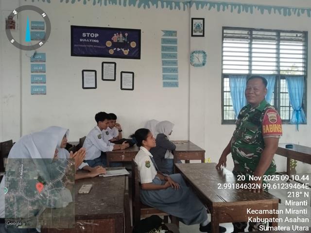 Asahan | Dalam rangka untuk tanamkan Nilai-nilai kebangsaan sejak dini kepada generasi penerus Bangsa, dalam kesempatan ini seperti yang dilakukan oleh Personel Bintara Pembina Desa (Babinsa) Koramil 18/Meranti jajaran Kodim 0208/Asahan Serka Bangun Napitupulu turun kewilayah binaan untuk turut serta melaksanakan kegiatan Wasbang dan Bimbingan tentang kenakalan remaja serta melatih PBB untuk siswa/siswi, kegiatan Wanwil materi Wasbang kepada siswa siswi yayasan pendidikan Daerah Meranti, dengan tujuan pelaksanaan untuk memberikan pengarahan kepada siswa siswi yayasan pendidikan Daerah Meranti perlunya memiliki wawasan kebangsaan, cinta Tanah air dan memberi arahan agar tidak terpengaruh terhadap lingkungan sekitar serta menjauhi Narkoba, bersama dengan Para siswa siswi yayasan pendidikan Daerah Meranti, kegiatan tersebut yang dilaksanakan bertempat di Yayasan Daerah Meranti Desa Meranti Kecamatan Meranti Kabupaten Asahan, Kamis (20/11/2025).