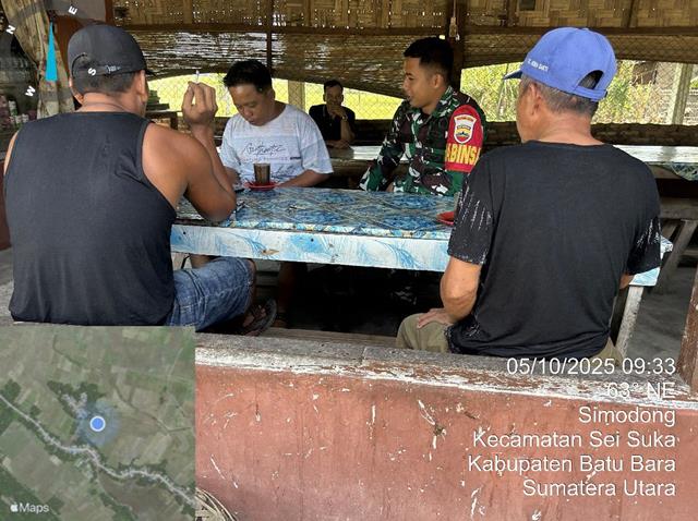 Dalam rangka agar terjalinnya hubungan dan Komunikasi yang baik antara Babinsa dengan masyarakat Desa binaan serta agar terjalinnya hubungan yang baik antara Babinsa dan masyarakat binaan. Dalam kesempatan ini seperti halnya yang dilakukan oleh Personel Bintara Pembina Desa (Babinsa) Koramil 02/Air Putih jajaran Kodim 0208/Asahan Sertu Mhd Firanda turun kewilayah binaan untuk melaksanakan kegiatan Komunikasi Sosial (Komsos) bersama dengan warga masyarakat binaan tentang keamanan dan ketertiban, Komsos dengan Masyarakat binaan menjalin silahturahmi dan kedekatan dgn rakyat serta membicarakan perkembangan situasi Keamanan dan ketertiban di wilayah desa binaan juga agar tetep terjalin hubungan silaturahmi yang erat antara Babinsa dengan masyarakat binaan, Komsos bersama masyarakat tentang hidup Rukun Bertetangga, saling menghormati untuk menciptakan lingkungan yang damai, nyaman dan Harmonis, bersama dengan Bapak Ali (Warga), Bapak Benget (Warga) dan Bapak Indra Hutasoit (Warga), kegiatan tersebut yang dilaksanakan bertempat di Desa Simodong Kecamatan Sei Suka Kabupaten Batu Bara, Minggu (05/102/2025).