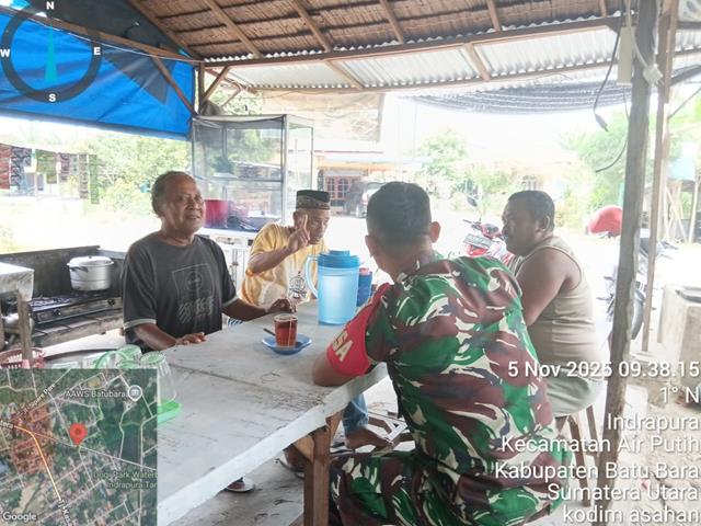 Batu Bara | Dalam rangka untuk menjalin silaturahmi yang baik dengan warga desa binaan serta menjaga keamanan diwilayah, dalam kesempatan ini seperti yang dilakukan oleh Personel Bintara Pembina Desa (Babinsa) Koramil 02/Ari Putih jajaran Kodim 0208/Asahan Serda Hardianto turun kewilayah binaan untuk melaksanakan kegiatan Komunikasi Sosial (Komsos) bersama dengan warga Masyarakat binaan dalam rangka membahas tentang keamanan lingkungan desa dengan menggalakan kembali Pos Kamling, Komsos bersama masyarakat di Wilayah Binaan diwarung Bapak Man, Komsos dengan masyarakat dilaksanakan untuk mempererat hubungan silaturahmi sehingga tercipta kemanunggalan TNI dengan rakyat, bersama dengan Bapak Man (pemilik warung), Bapak Bibit (masyarakat) dan Bapak Basar (masyarakat), kegiatan tersebut yang dilaksanakan bertempat di Lingkungan 4 Kelurahan Indra Sakti Kecamatan Air Putih Kabupaten Batu Bara, Rabu (05/11/2025).