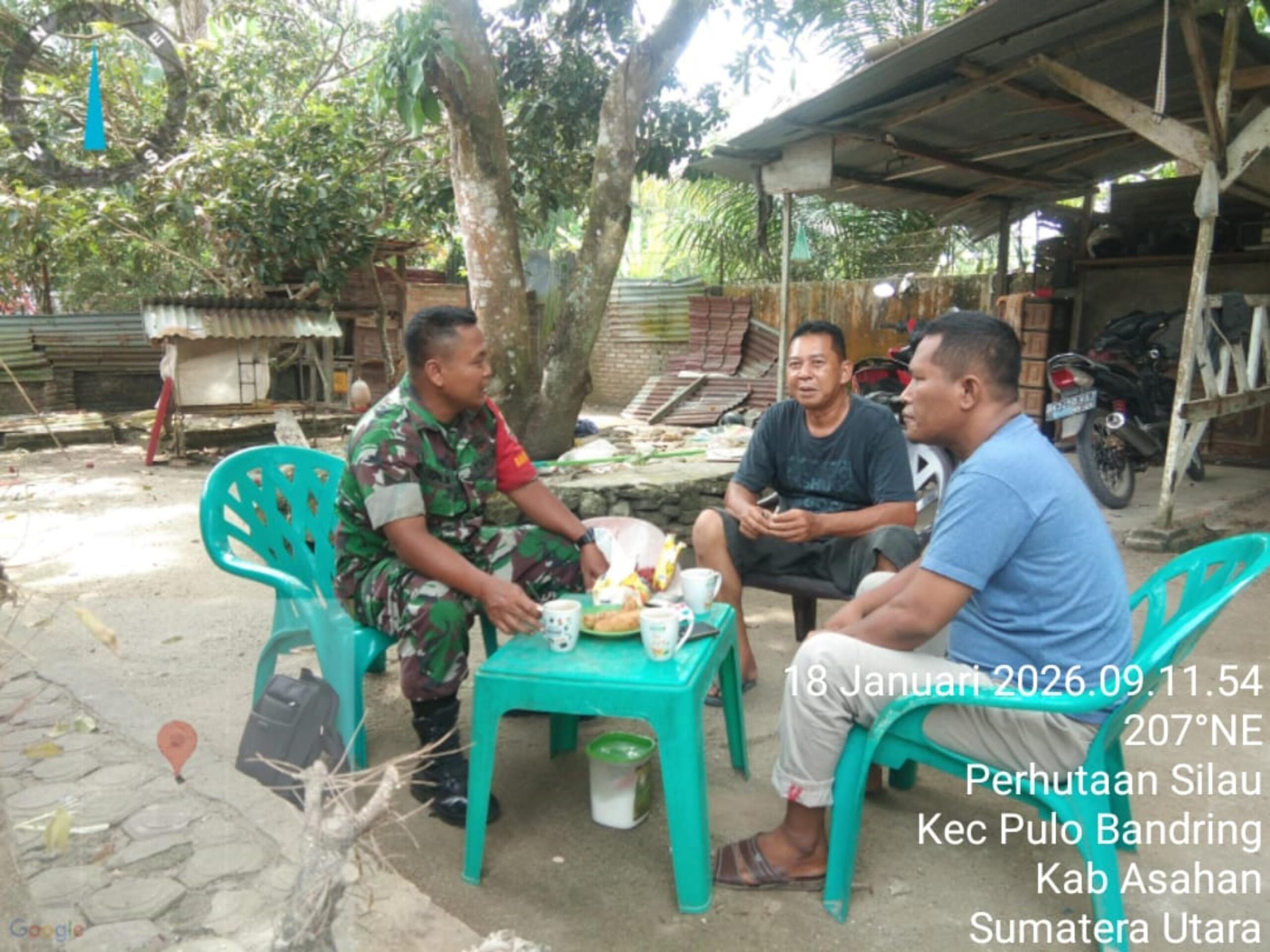 Asahan | Dalam rangka untuk menjalin silaturahmi yang baik dengan warga desa binaan serta menjaga keamanan diwilayah, dalam kesempatan ini seperti yang dilakukan oleh Personel Bintara Pembina Desa (Babinsa) Koramil 18/Meranti jajaran Kodim 0208/Asahan Serka Suparlan turun kewilayah binaan untuk melaksanakan kegiatan Komunikasi Sosial (Komsos) bersama dengan warga Masyarakat binaan dalam rangka membahas tentang keamanan lingkungan desa dengan menggalakan kembali Pos Kamling, kegiatan Komsos dengan warga, kegiatan Komsos sebagai sarana untuk mengenal lebih dekat dengan warga binaan sehingga tercipta hubungan yang humanis antara babinsa dan seluruh warga,pada setiap kesempatan babinsa senantiasa mengajak kepada seluruh warga agar dapat menumbuhkan rasa toleransi dan semangat tolong menolong kepada semua warga agar situasi kamtibmas desa tetap aman dan kondusif, bersama dengan Bapak Widodo (Kadus 2) dan Bapak Arman (Dusun 2), kegiatan tersebut yang dilaksanakan bertempat di Desa Perhutaan Silau Kecamatan Pulo Bandring Kabuaten Asahan, Minggu (18/01/2026).