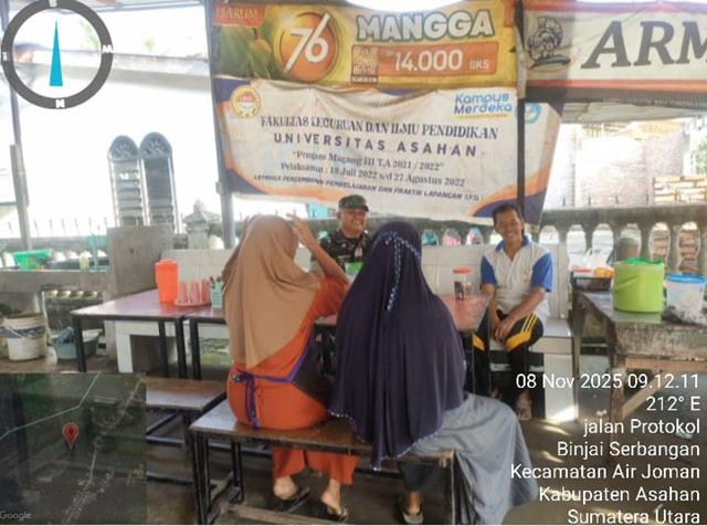 Asahan  |  Kegiatan Komsos bersama warga ini rutin dilakukan para Babinsa diwilayah desa binaan dan kegiatan ini sudah menjadi tugas pokok para Babinsa sebagai Babinsa diwilayah binaan, himbauan yang disampaikan para Babinsa kepada warga merupakan bentuk kepedulian kita terhadap kebersihan lingkungan dan Kamtibmas di wilayah binaan, inilah yang dilakukan untuk mewujudkan hal tersebut yakni seperti yang dilakukan oleh Personel Babinsa Koramil 07/Air Joman jajaran Kodim 0208/Asahan Serda Armain S turun kewilayah binaan untuk melaksanakan kegiatan Komunikasi Sosial (Komsos) bersama dengan warga masyarakat desa binaan dalam rangka untuk membahas tentang Keamanan dan kebersihan lingkungan, bersama dengan Bapak Wagino, Ibu Idah (Pemilik Warung), Ibu Nuri dan Ibu Juriah, kegiatan tersebut yang dilaksanakan beralamat di Warung Ibu Idah Lingkungan VI Kelurahan Binjai Serbangan Kecamatan Air Joman Kabupaten Asahan, Sabtu (08/11/2025).
