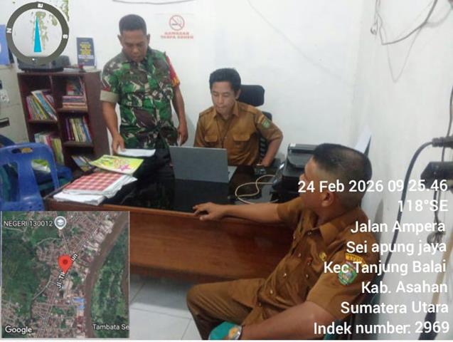Asahan  |  Dalam rangka untuk mensukseskan tugas-tugas pemerintah yang ada diwilayah binaan serta meperbaharui data kewilayahan, dalam kesempatan ini seperti yang dilakukan oleh Personel Bintara Pembina Desa (Babinsa) Koramil 08/Pulau Buaya jajaran Kodim 0208/Asahan Kopda Fadli Siagian turun kewilayah desa binaan untuk melaksanakan kegiatan Pul Data Ter bersama Aparatur Pemerintahan, dengan melaksanakan kegiatan mendata Jumlah penduduk di Kantor Desa, bersama Aparatur Desa melaksanakan Pul Data Ter dalam pengecekan Geo Demo Konmsos, Puanter Pendataan jumlah penduduk di tahun 2026 guna memperbarui data jumlah perkembangan angka Kematian dan kelahiran agar tidak terjadi kesalahan, Babinsa Sekaligus menjalin kerjasama dan hubungan yang baik guna terjalin silaturahmi Rahmi yang baik antara Babinsa dan perangkat Desa, bersama dengan Bapak Rudianto dan Ibu Rosdiana, kegiatan tersebut yang dilaksanakan bertempat di Jalan Ampera Sei Apung Jaya Kecamatan Tanjung Balai Kabupaten Asahan, Selasa (24/02/2026).