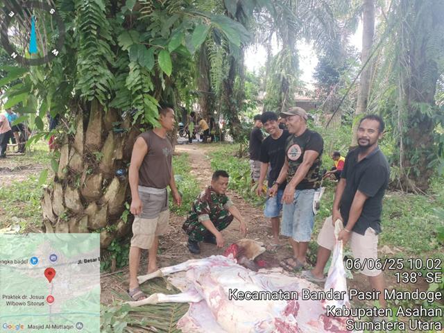 Asahan  |  Semangat Hari Raya Idul Adha 1446 H, dalam kesempatan ini seperti yang dilakukan oleh Personel Bintara Pembina Desa Koramil  14/Bandar Pasir Mandoge jajaran Kodim 0208/Asahan Peltu D Siburian turun kewilayah binaan untuk melaksanakan kegiatan Komunikasi Sosial (Komsos) bersama masyarakat melaksanakan pemotongan kurban lembu dan kambing dalam rangka Hari raya Idul Adha 14446 H, kegiatan tersebut diharapkan dapat mempererat hubungan kekompakan dan keharmonisan dalam menunjang tugas pokok TNI agar semakin dicintai rakyat, bersama dengan Kadus 2, Bapak Sakban, Bapak Julpan dan Bapak Anto, kegiatan tersebut yang dilakukan bertempat di Dusun II Desa Mandoge Kecamatan Bandar Pasir Mandoge Kabupaten Asahan, Sabtu (07/06/2025).