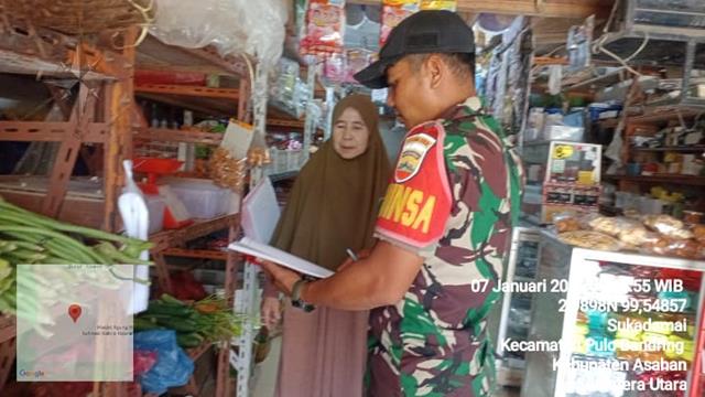 Asahan | Guna meningkatkan jalinan komunikasi sosial dengan warga pedagang Semboako diwilayah binaannya, dan mengecek harga sembako sekaligus mengetahui situasi dan kondisi keamanan di sekitar pasar Tradisional diwilayah binaan, dalam hal ini seperti yang dilakukan oleh Personel Bintara Pembina Desa (Babinsa) Koramil 18/Meranti jajaran Kodim 0208/Asahan Serma Jalil turun kewilayah binaan untuk melaksanakan kegiatan Komunikasi Sosial (Komsos) bersama dengan pedagang sembako sekaligus pendataan harga sembako, dengan melaksanakan puldata ter dengan memonitoring kestabilan harga sembako dan ketersedian bahan-bahan pokok, Komsos dengan pedagang sembako Ibu Susilawati (Pedagang), kegiatan tersebut yang dilaksanakan bertempat di Dusun V Desa Suka Damai Kecamatan Pulo Bandring Kabupaten Asahan, Rabu (07/01/2026).