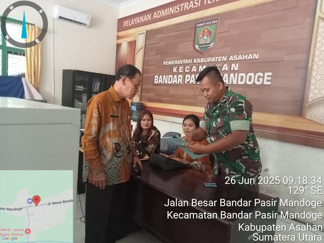 Asahan  |  Dalam rangka meningkatkan sinergitas di wilayah binaanya, pada kesempatan ini seperti yang dilakukan oleh Personel Bintara Pembina Desa (Babinsa) Koramil 14/Bandar Pasir Mandoge jajaran Kodim 0208/Asahan Kopda Suyanto bersama Aparatur Pemerintahan turun kewilayah binaan untuk melaksanakan kegiatan Pul Data Ter dalam rangka mengetahui dan merubah data Geo, Demo, Komsos bersama dengan perangkat Desa serta membahas kondisi dan perkembangan wilayah untuk mewujudkan ketahanan wilayah dan kemanunggalan TNI bersama rakyat, pengecekan Puldatater Geo Demo Konsos bidang Kependudukan untuk melakukan pendataan mayarakat yang belum memiliki KTP serta menumbuhkan hubungan silahturahmi dan kerjasama yang baik antara Babinsa dengan aparatur Pemerintahan, bersama dengan Bapak Saut Sitorus Kasi Pem, Ibu Prima Sinurat dan Ibu Bonita Sinaga, kegiatan tersebut yang dilaksanakan bertempat di Kantor Camat Bandar Pasir Mandoge Dusun II Desa Bandar Pasir Mandoge Kecamatan Bandar Pasir Mandoge Kabupaten Asahan, Jumat (27/06/2025).