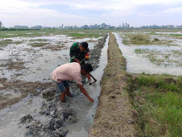 Perbaiki Bedengan Sawah Bersama Petani Dilakukan Personel Koramil 01/MD Kodim 0208/Asahan