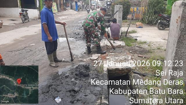 Batu Bara | Dalam rangka untuk menjaga kebersihan dan keindahan lingkungan serta guna mengantisipasi banjir pada musim hujan seperti sekarang ini, dalam kesempatan tersebut Personel Bintara Pembina Desa (Babinsa) Koramil 01/Medang Deras jajaran Kodim 0208/Asahan Sertu Jafrel turun kewilayah binaan untuk melaksanakan kegiatan Gotong royong bersama dengan masyarakat melaksanakan Gotong Royong, dengan melaksanakan Gotong Royong Bersama warga binaan membersihkan Parit dari rumput yg menjalar dan Tumpukan sampah yang menyumbat aliran parit bertujuan agar air dapat mengalir dengan lancar untuk menghindari Banjir di saat musim Hujan serta meningkatkan kerja sama yang baik dan menjaga keharmonisan Babinsa dan warga binaan, bersama dengan Bapak Erwinsyah (Kadus), Bapak Rozy, Bapak Zulkarnain, Bapak Junaidi dan Bapak Herman, kegiatan tersebut yang dilaksanakan bertempat di Desa Sei Raja Kecamatan Medang Deras Kabupaten Batu Bara, Selasa (27/01/2026).