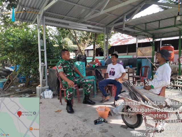 Batu Bara  |  Dalam rangka agar terjalinnya hubungan baik Antara Babinsa dengan Warga masyarakat agar mengetahui situasi yang terjadi diwilayah desa binaan dan hubungan yang harmonis antara Babinsa dengan masyarakat, dalam kesempatan ini seperti yang dilakukan oleh Personel Bintara Pembina Desa (Babinsa) Koramil 01/Medang Deras jajaran Kodim 0208/Asahan Sertu H Manik turun kewilayah binaan untuk melaksanakan kegiatan Komunikasi Sosial (Komsos) bersama dengan warga Masyarakat binaan dalam rangka guna menjalin hubungan Silaturahmi Antara Babinsa bersama warga masyarakat wilayah binaan, Komsos bersama warga Binaan guna menjaga hubungan yang baik dengan cara menjalin komunikasi agar kehadiran Babinsa dapat diterima ditengah tengah masyarakat, bertujuan menggali informasi yang berkembang sehingga dapat melakukan deteksi dini dan cegah dini di wilayah binaan  untuk mendukung Tugas Pokok Babinsa, bersama dengan Bapak K Manalu, Bapak Rikardo dan Bapak Tomson Sinurat, kegiatan tersebut yang dilaksanakan bertempat di  Desa Tanjung Sigoni Kecamatan Medang Deras Kabupaten Batu Bara, Jumat (06/06/2025).